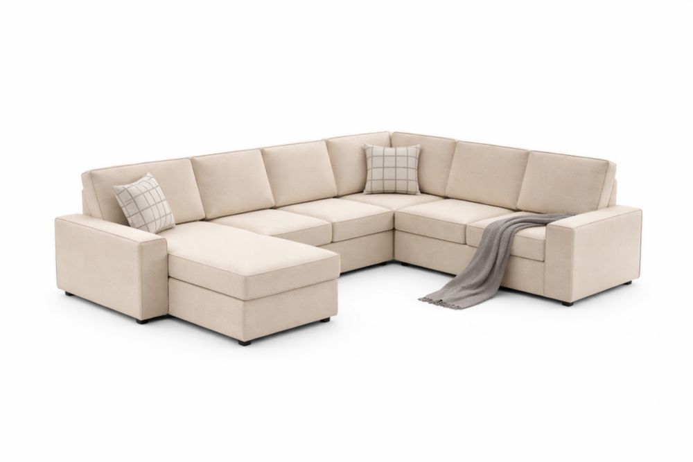 Divano angolare in tessuto beige con chaise longue
