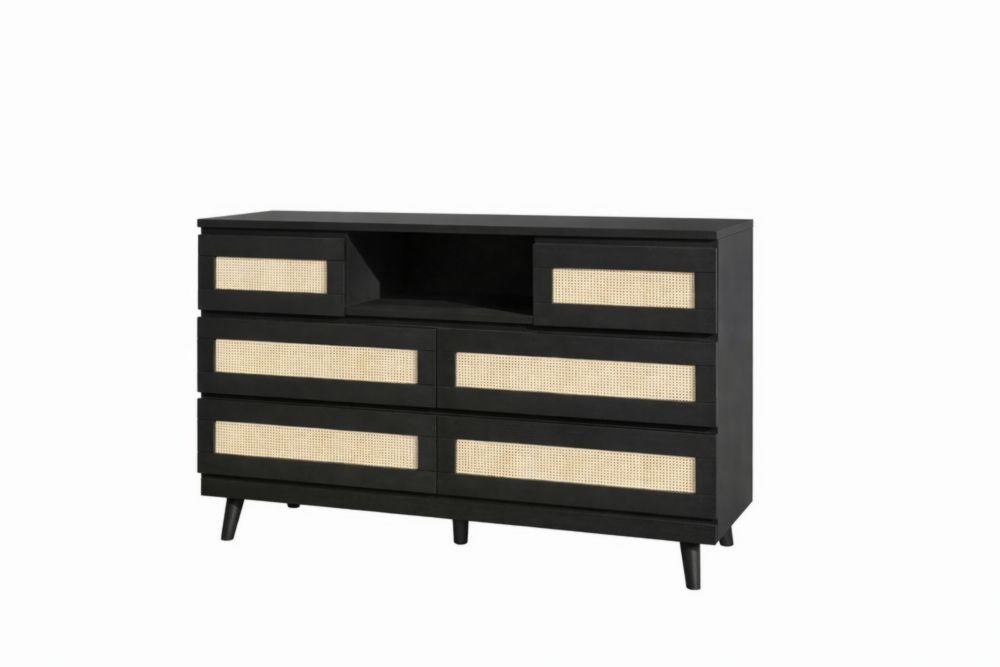 Cassettiera in Legno masselloNero con Dettagli in Rattan