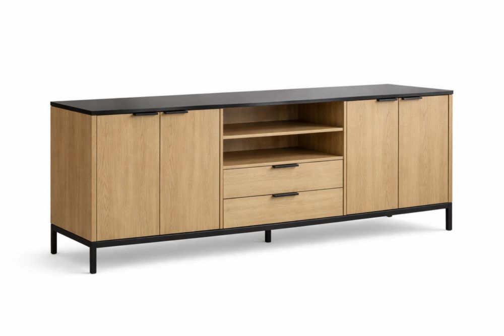 Credenza in legno MDF rovere con ripiano superiore in melaminico nero 200x45x80 cm