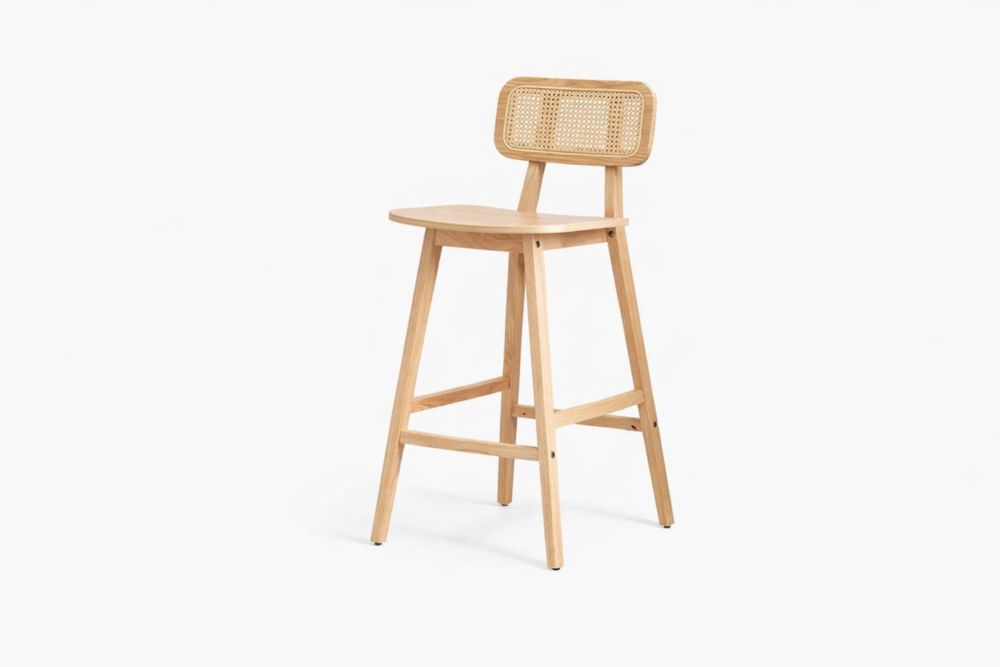 Sgabello alto in Legno massello di faggio con schienale in paglia intrecciata