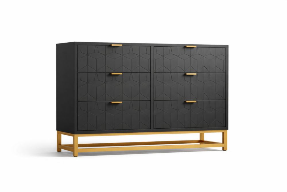 Cassettiera in Legno massello nera con base in acciaio dorato 6 cassetti