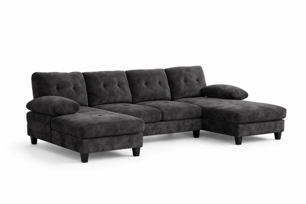 Questo divano angolare presenta un rivestimento in tessuto di poliestere grigio scuro. La struttura è stabile e le sedute sono imbottite con spugna ad alta densità. Le dimensioni del divano sono: altezza 85 cm, larghezza 290 cm, profondità 150 cm. L'altezza della seduta è di 45 cm, mentre la profondità della seduta è di 60 cm. Il peso complessivo del divano è di 70 kg. È consigliata la pulizia con un panno umido ed evitare l'esposizione diretta al sole.