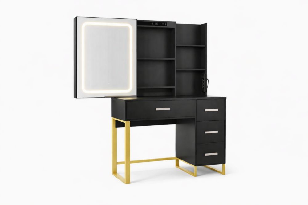 Scrivania Nera con Specchio Illuminato e Cassetti in Acciaio inossidabile