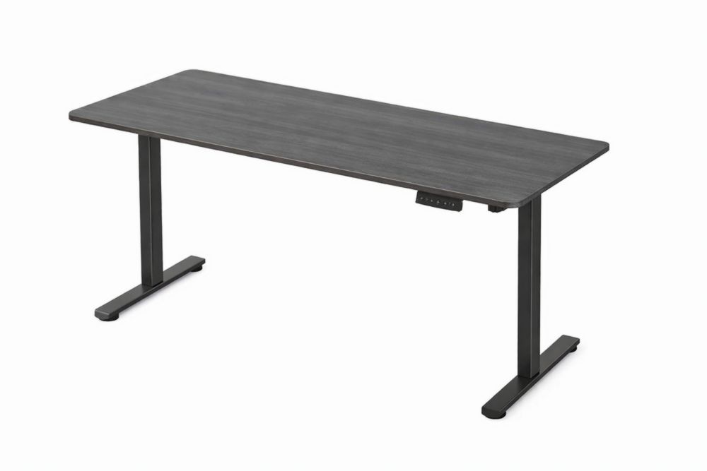 La scrivania regolabile è realizzata con un piano in MDF con finitura effetto legno e una struttura in acciaio verniciato a polvere.